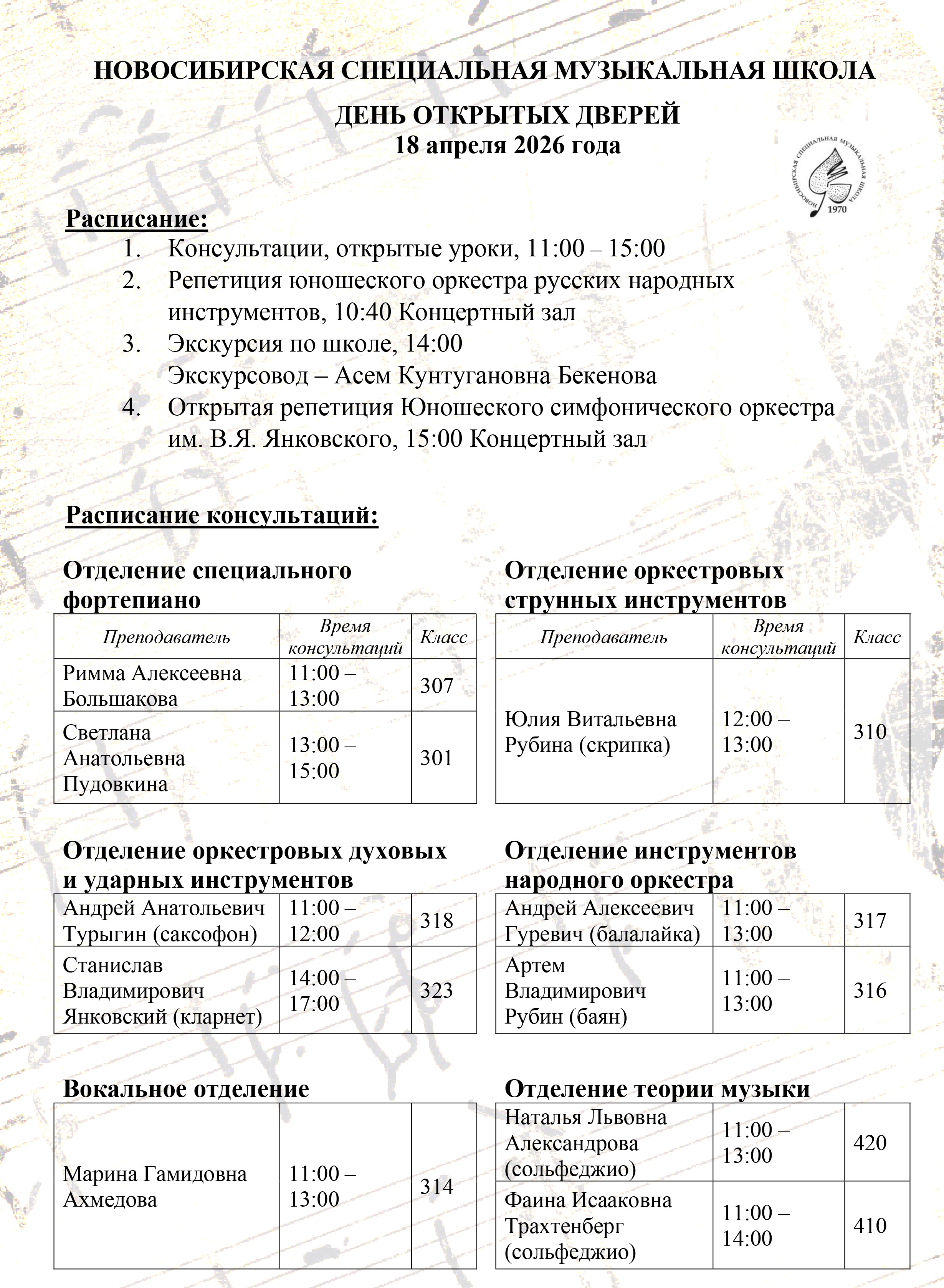18 апреля 2026 года Новосибирская специальная музыкальная школа проводит консультации абитуриентов по специальностям: